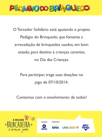 O Torcedor Solidário está apoiando o projeto Pedágio do Brinquedo, que fomenta a arrecadação de brinquedos usados em bom estado, para destino à crianças carentes no Dia das crianças!